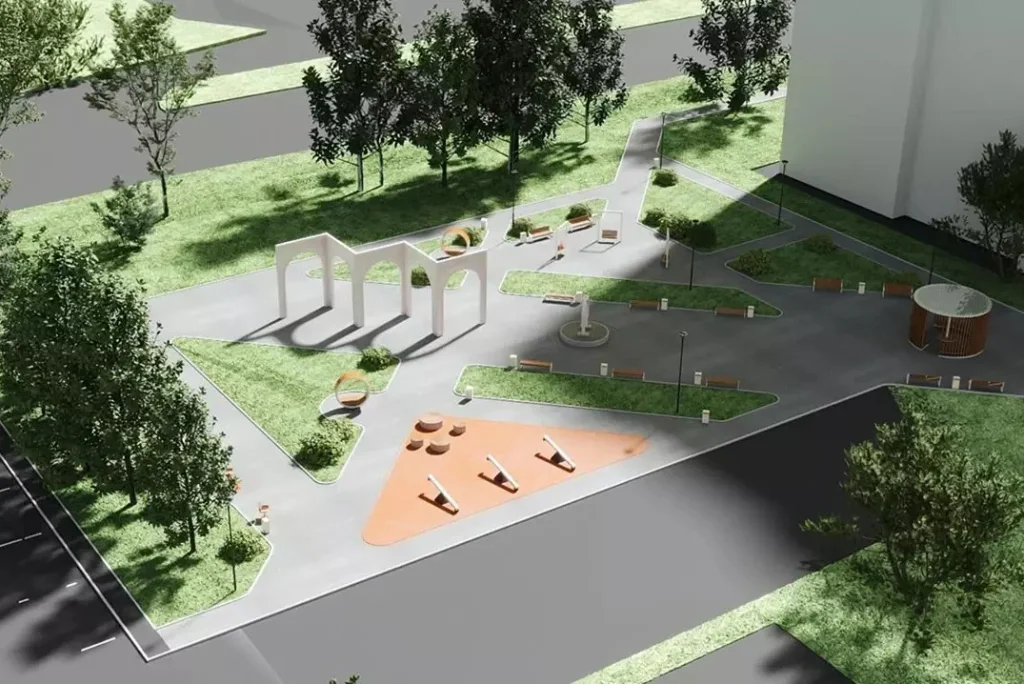 Концепция включает в себя обустройство зоны отдыха для взрослых и детей, игровой площадки и парковки. Также будут