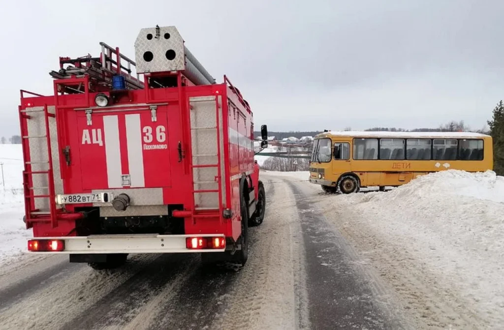 Вытащить из снега школьный автобус помогли сотрудники МЧС в Заокском районе Тульской области