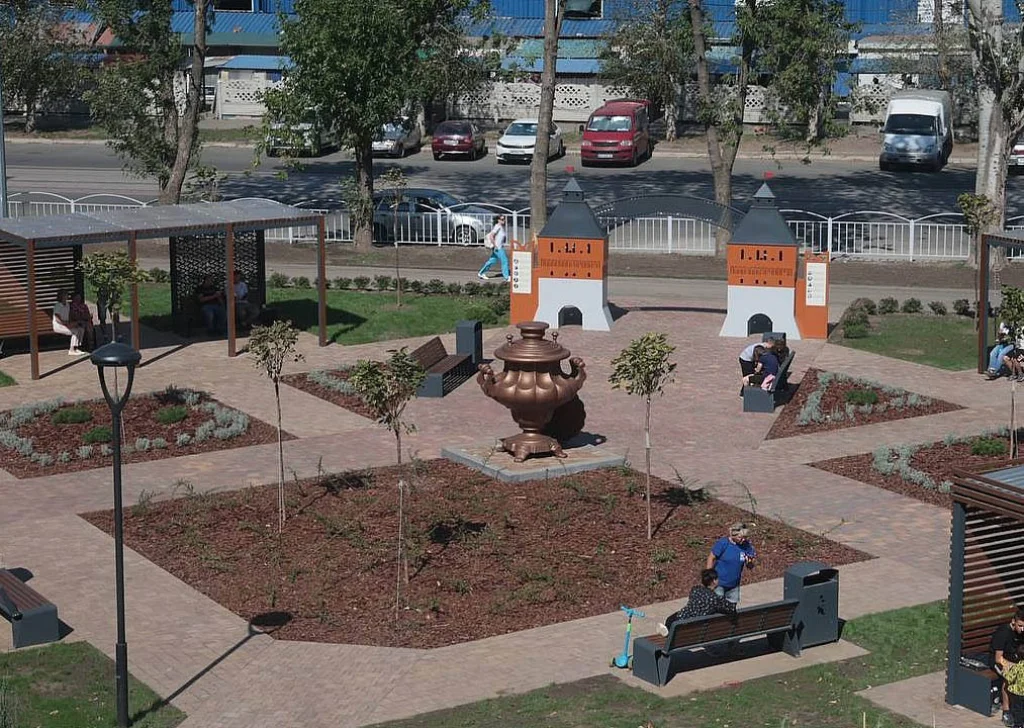 Общественное пространстве украсили объекты в виде Тулы - самовара и пряника. Входная группа в сквере стилизована