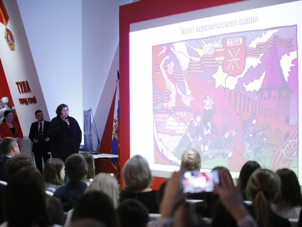 Две работы легли в основу керамического панно, которое появится в парке «Патриот-Тула» к 80-летию Победы в Великой Отечественной войне. Эскиз панно презентовали на встрече.