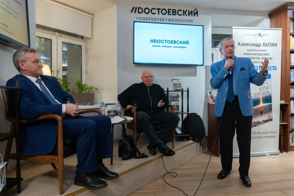 А в этот раз живая беседа состоялась в книжном магазине «Достоевский», рядом с московским кремлем. Несколько дней назад там собрался цвет столичной интеллигенции. А поводом стала презентация книги Лапина «Копье Пересвета» (16+).