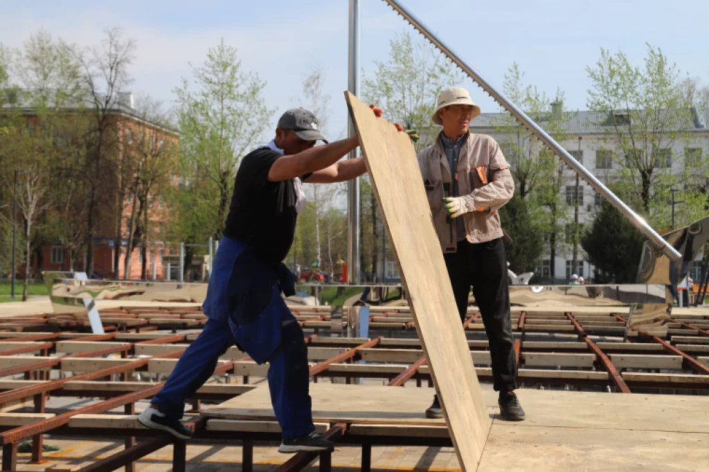 Специалисты начали разбирать части каркаса из брусьев, снимать укрывной материал. Подготавливается насосное оборудование, устанавливаются подводные светильники и форсунки. После очистки чаш фонтанов от мусора и грязи систему заполнят водой,