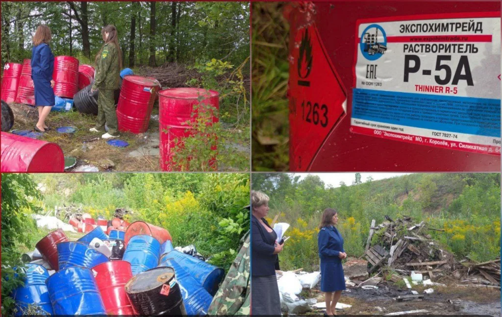 В ходе совместного выезда с участием специалистов контролирующих органов и представителей местной администрации обнаружены многочисленные металлические бочки с маркировкой «растворитель», пластиковые канистры и строительный мусор. На почве наблюдаются следы разливов неизвестной темной жидкости.