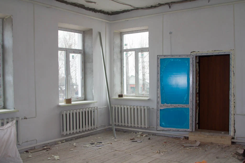Сейчас почти полностью завершена штукатурка стен. Продолжаются отделочные работы. В помещении необходимо доделать потолки и постелить полы.
