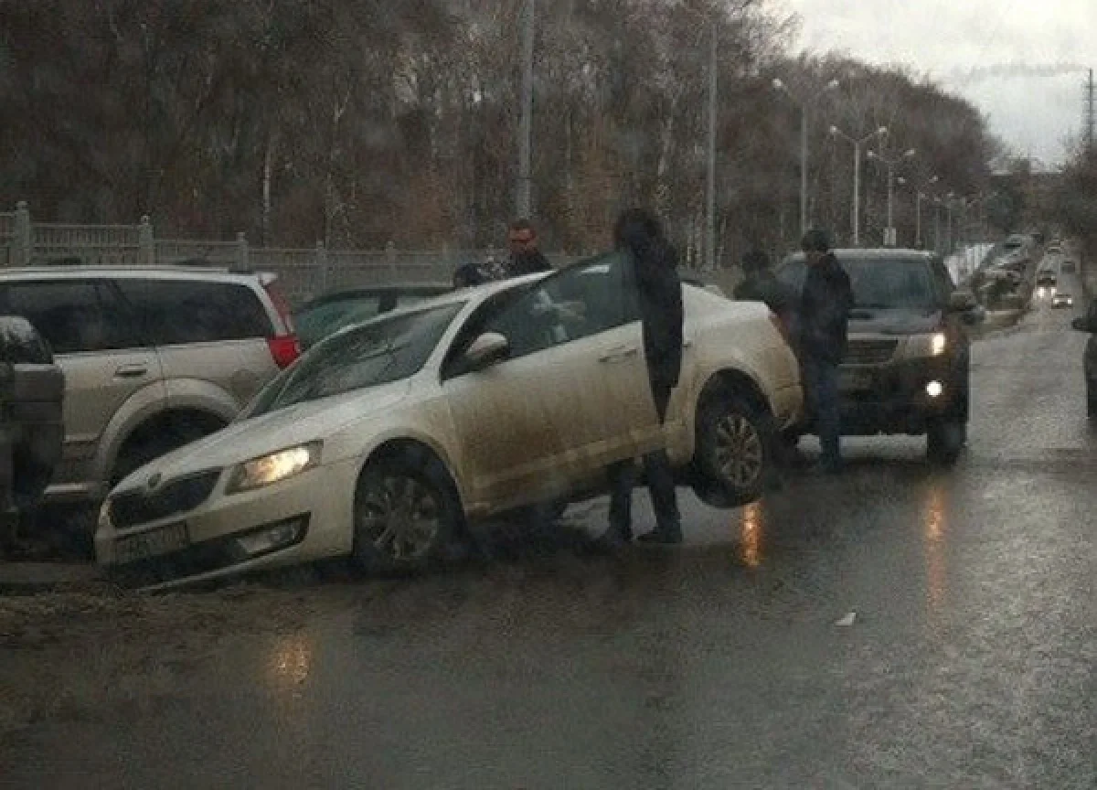 На автодороге по улице Тульского рабочего полка образовалась огромная яма. В ловушку угодил легковой автомобиль.