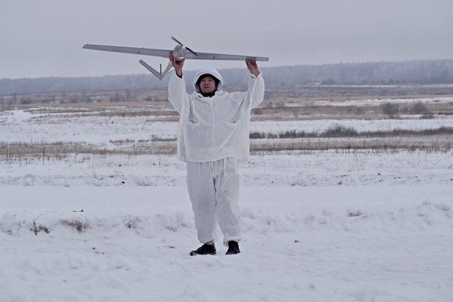 (БПЛА) проводят его запуск для изучения местности учебного боя. Летательный аппарат используется для разведки