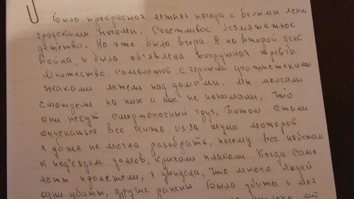 …была объявлена воздушная тревога. Множество самолётов с чёрными фашистскими знаками летели над домами. Мы молчали, смотрели на них и ещё не понимали, что они несут смертоносный груз. Из-за шума моторов я даже не могла разобрать, почему все побежали к подъездам домов, кричали, плакали. Когда самолёты пролетели, я увидела много раненных и убитых людей. Среди них оказалась и моя подруга Машенька, которая жила недалеко от моего дома. Этот ужас, который передать невозможно — вчера она играла в прятки со мной, а сегодня убита…