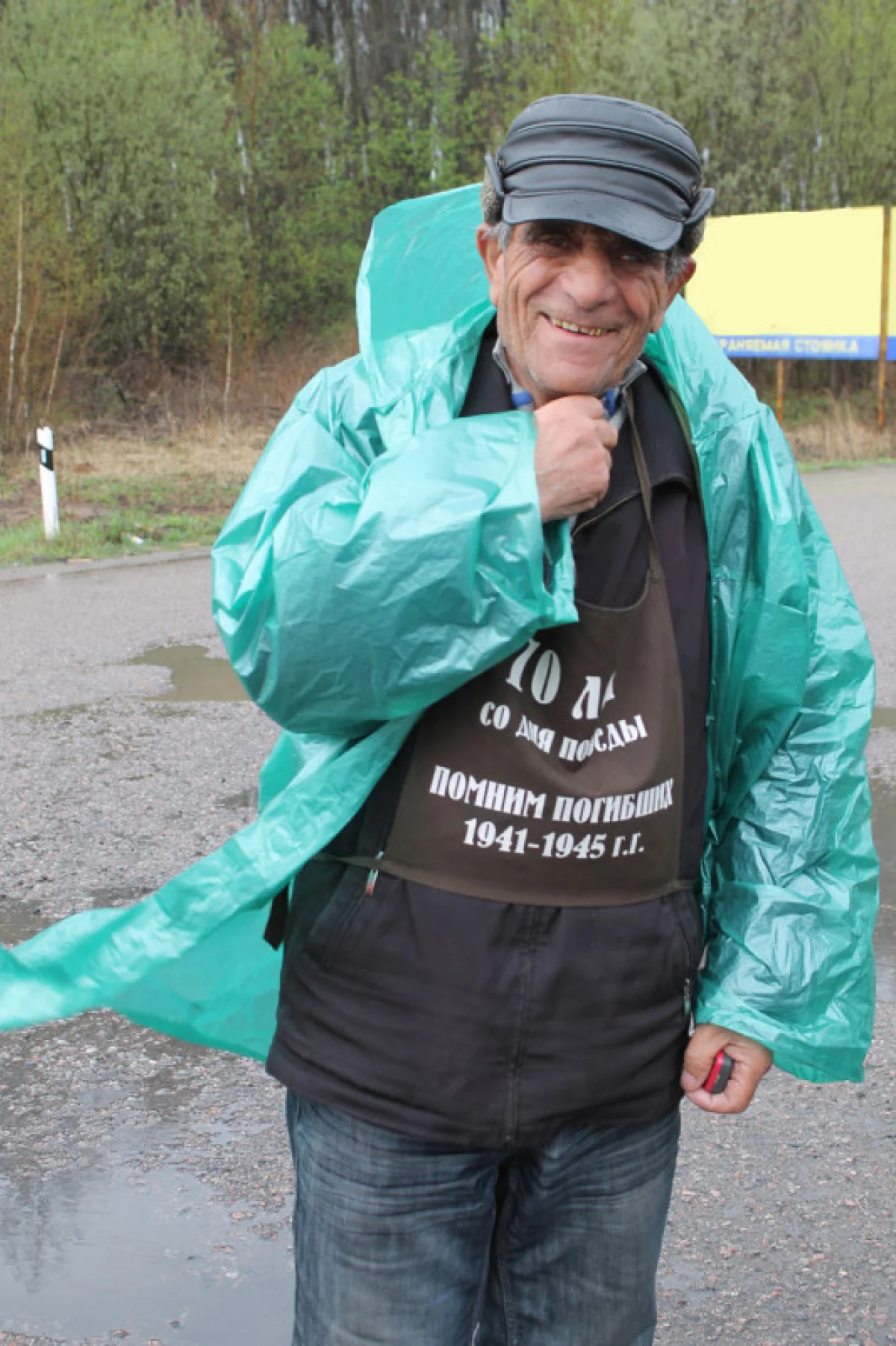 Заранее пенсионер не планирует свои остановки, ночует там где застанет ночь. Часто автомобилисты предлагают подвезти, но гость из Еревана отвечает отказом. С собой у путешественника вещмешок с самым необходимым и надписью «70 лет со Дня Победы. Помним погибших 1941-1945 гг.». Такая же надпись на груди.