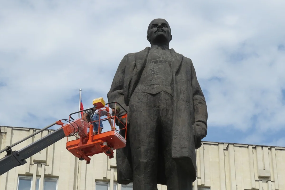 На главной площади города привели в порядок памятник Владимиру Ленину. Специалистов подняли на высоту в специальной
