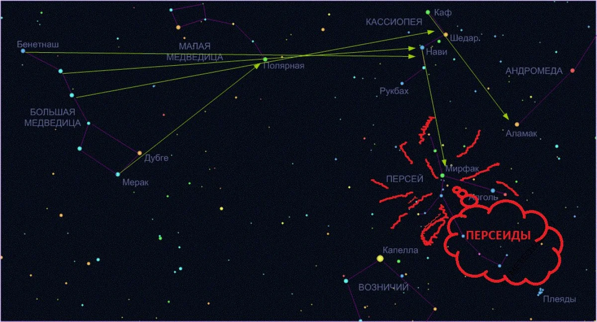 - Метеороиды входящие в нашу атмосферу можно увидеть посмотрев на созвездие «Персея», – поясняет Ирина Клепилина, заведующая кафедрой общей и теоретической физики педагогического университета. - Чтобы отыскать его на небосводе надо стать лицом на север и найти Полярную звезду. От нее визуально провести вертикальную линию вниз-вправо, под углом 30 градусов до пересечения с Млечным путем (самое большое скопление звезд). В этой точке пересечения будет созвездие «Персей». Из этого созвездия и приходят, так называемые, «Персеиды».