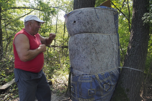 Помимо штанг и трапеции Николай Павлович сделал брусья для гимнастических занятий и несколько перекладин для подтягивания. Можно в зале и пресс качать и отжиматься. А из простого матраса, обмотанного вокруг дерева, умелец соорудил импровизированную боксерскую грушу.