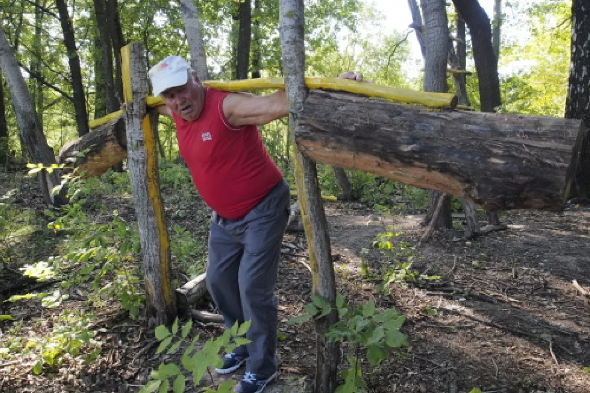 - Место для «тренажерки» нашел случайно, - рассказывает Николай Павлович. - Прошлой зимой ходил на лыжах и выбирал место для пикника. На глаза попалась полянка на опушке с несколькими сухими дубами. Решил, что место для спортзала отличное. Летом в тени деревьев заниматься очень хорошо. В голове сразу появилась идея, что из «мертвых» деревьев гантели и штанги.