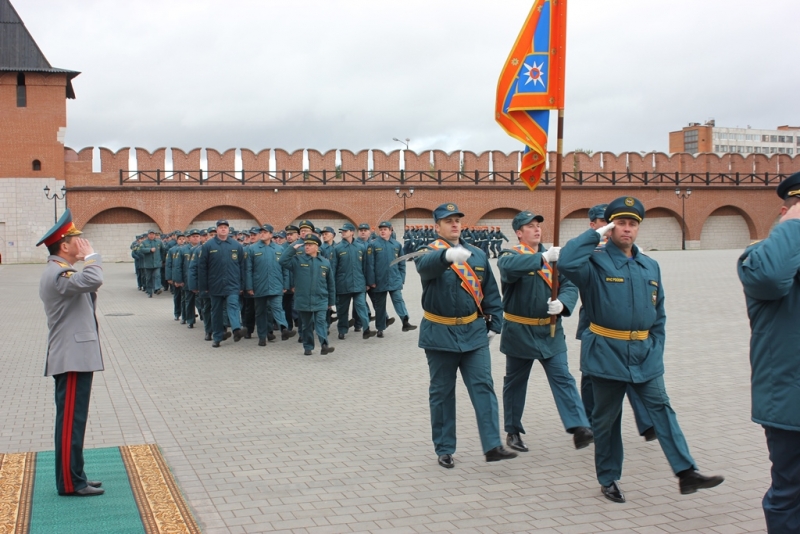 На середину строя под барабанную дробь со знаменем вышла знаменная группа. Наступила трогательная минута прощания со знаменем начальника Главного управления МЧС России по Тульской области. Затем по кремлевской брусчатке торжественным строем прошла колонна тульских спасателей.