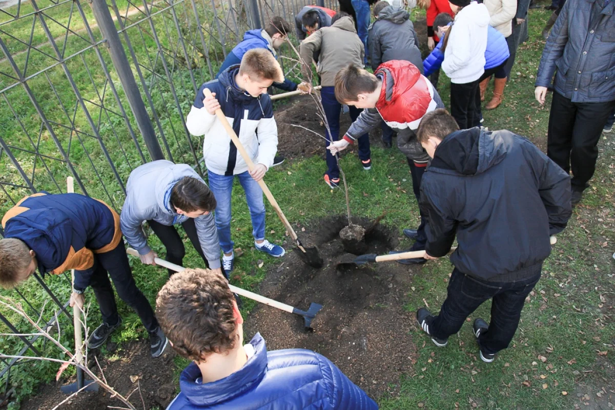 Деревья сажали активисты, волонтеры, педагоги и учащиеся школы.