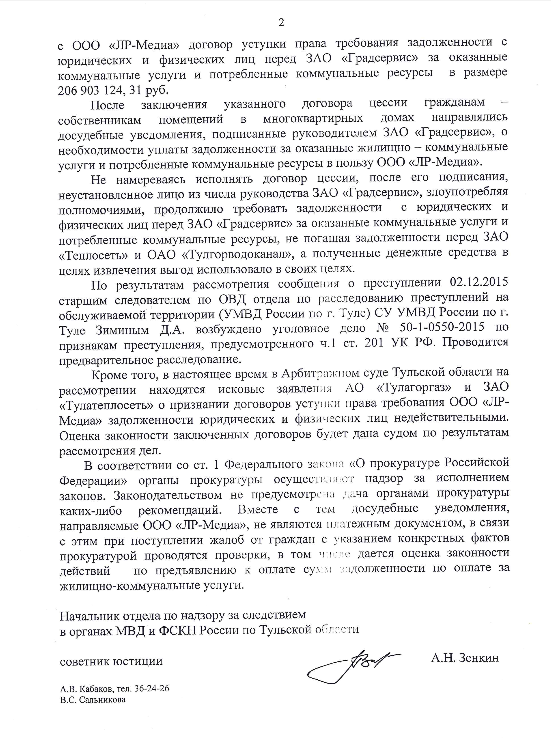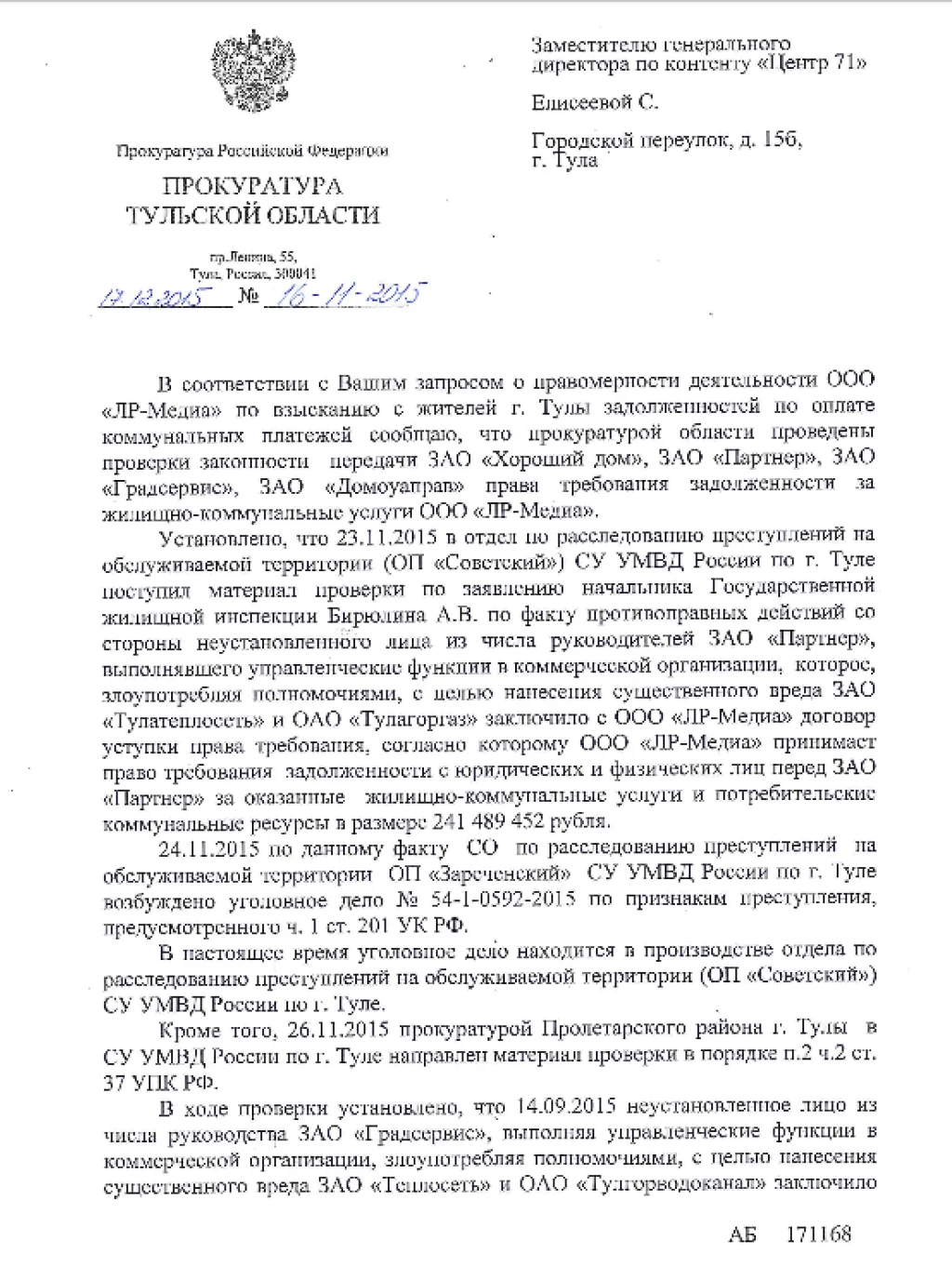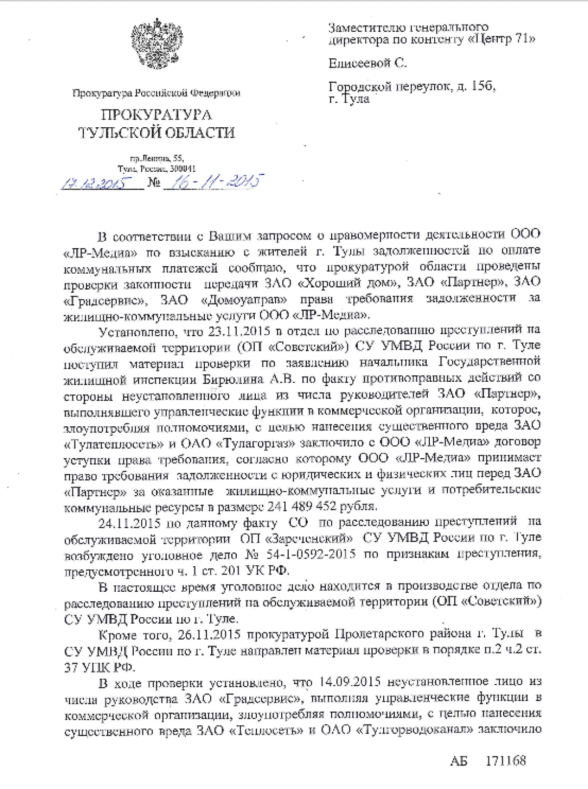 В соответствии с запросом о правомерности деятельности ООО «ЛР-Медиа» по взысканию с жителей г. Тулы задолженностей по оплате коммунальных платежей, прокуратура провела проверки законности передачи ЗАО «Хороший дом», ЗАО «Партнер», ЗАО «Домоуправ» права требования задолженности за жилищно-коммунальные услуги ООО «ЛР-Медиа».