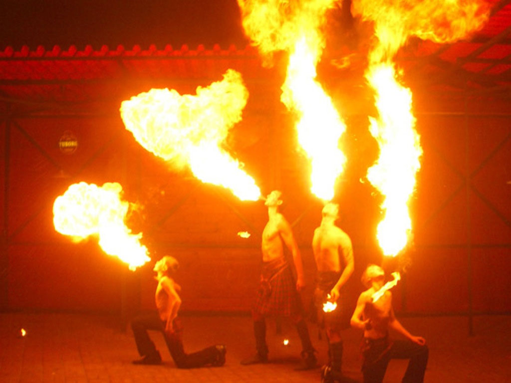 материала, затем в рот набирается керосин. Резкий выдох на факел — и яркий столб огня! Алексей вытворяет