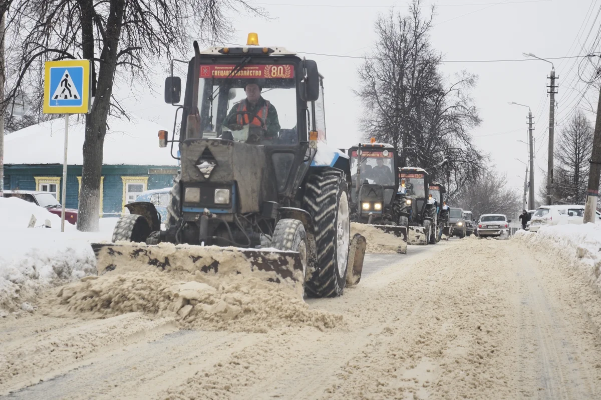 до ул. Калинина. Спецтехника расчищает проезжую часть и вывозит снег.
