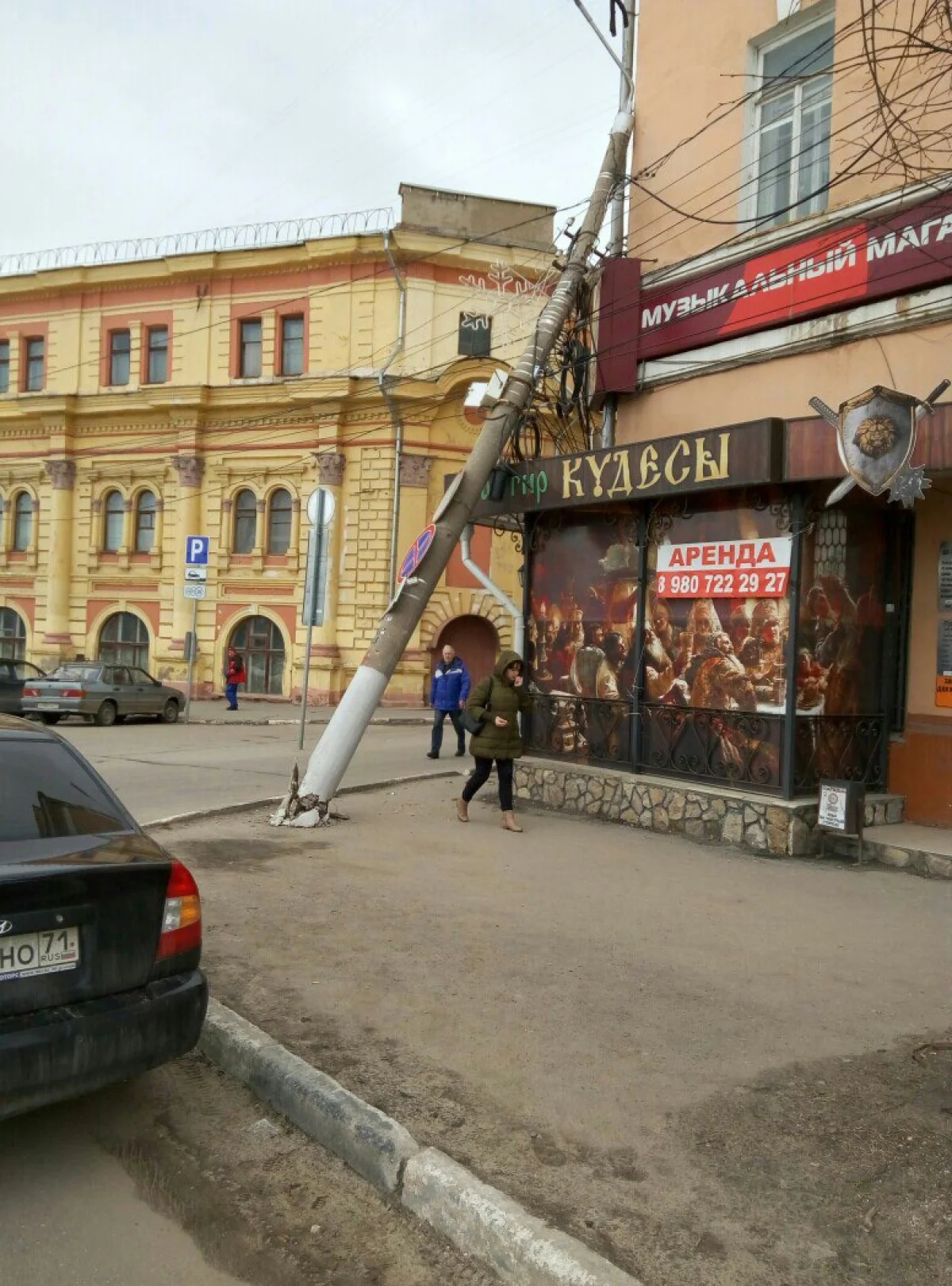 В центре Тулы на Крестовоздвиженской площади упала опора ЛЭП. По всей видимости, бетонный столб, увешанный проводами и дорожными знаками, просто устал стоять и оперся о близлежащий жилой дом.