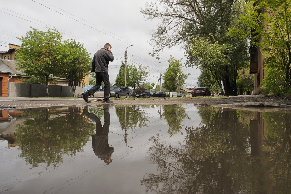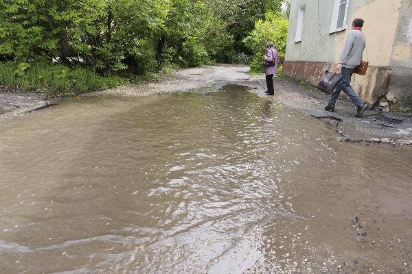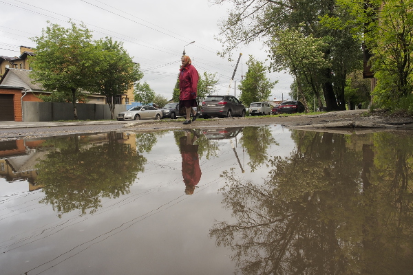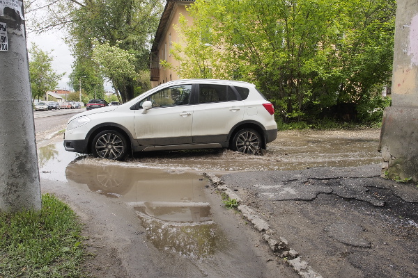 В дождь ситуация усугубляется еще больше. Выбоины превращаются в озера, и пешеходы, не решаясь искать брод, обходят лужи по проезжей части.