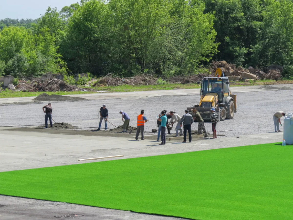 Газон уже начали укладывать, сообщается на сайте администрации Тулы. Также рабочие настилают резиновое покрытие беговых дорожек.