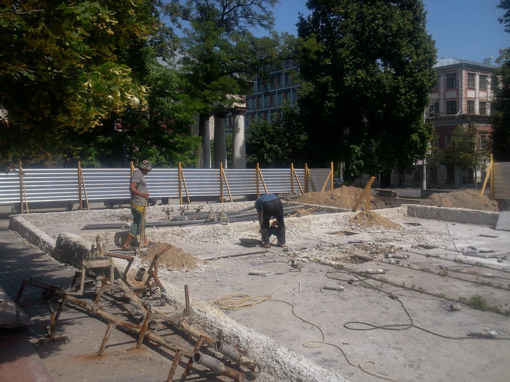 Специалисты подрядной организации выполнили демонтаж гранитной облицовки фонтанных чаш, демонтаж внешних трубопроводов, насосного оборудования, металлоконструкций и электрооборудования в насосном помещении.