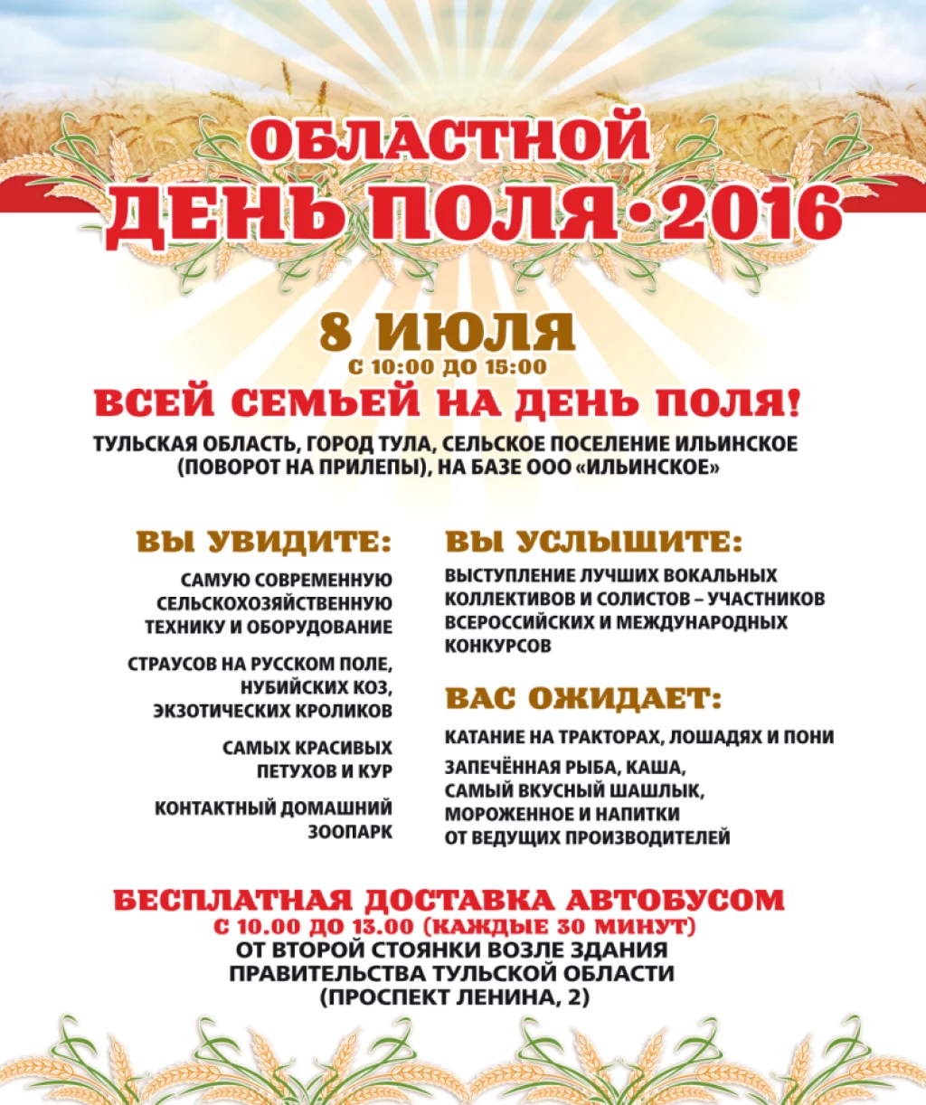 Мероприятие состоится 8 июля на базе ООО «Ильинское». Гости праздника смогут увидеть современную сельскохозяйственную технику и оборудование, покататься на тракторе, лошадях и пони, посмотреть выступление вокальных коллективов и солистов, познакомиться со страусами, нубийскими козами, и экзотическими кроликами.
