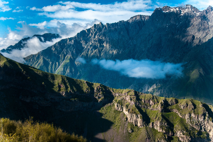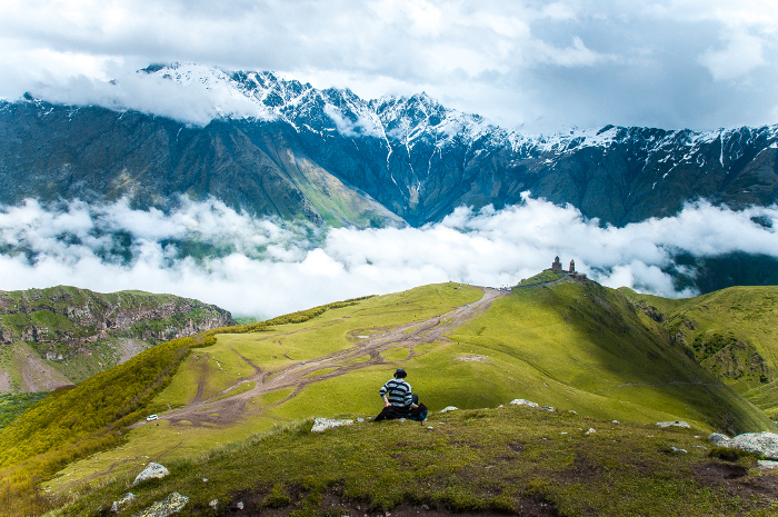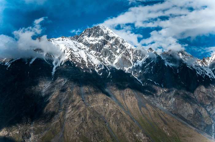 Микроавтобус мчит нас по Военно-Грузинской дороге в сторону Крестового перевала. Серпантин огибает горы и ущелья, где-то внизу шумят стремительные потоки рек, а на возвышенностях то и дело мелькают старинные крепости. За перевалом спуск до села Казбеги (ныне Степанцминда). Именно отсюда и начинается наше восхождение на Казбек.