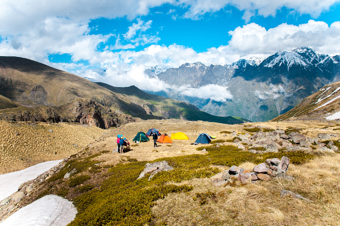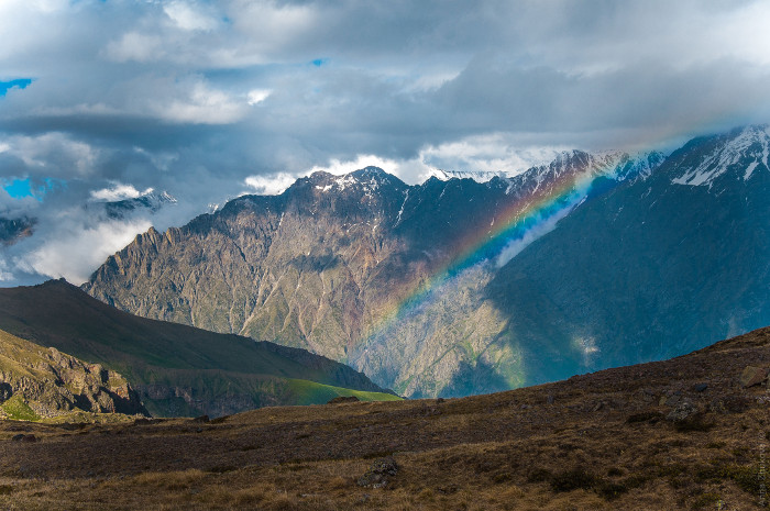 На перевале нас настигла непогода. Чтобы укрыться от дождя и ветра, инструктор принял решение спуститься в долину и разбить там лагерь. Сбросив рюкзаки в кучу, мы засмотрелись на окружающие пейзажи. Красновато-бурые скалы, синеющие вдали горы с серебристыми вершинами, белоснежные ледники, изумрудные склоны и золотистые помпоны травы.