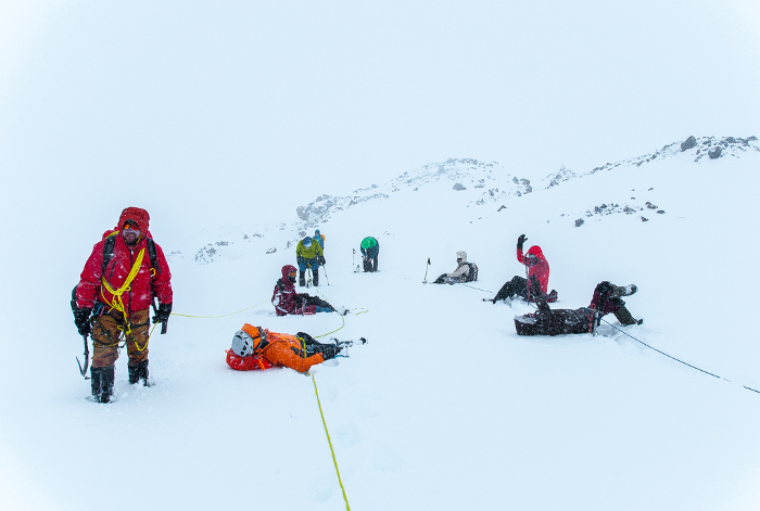 На штурм выходим с чувством пофигизма и неизбежности. Погода и не думала налаживаться. Снег валит не переставая, ледяной ветер сбивает с ног. Идём в связках, светя под ноги закрепленными на шлемах фонариками, чтобы случайно не наступить на ползущую по земле верёвку. Под нами ледник с глубокими закрытыми трещинами, в которые можно провалиться в любой момент, но 5 человек, связанных одной верёвкой, всегда удержат одного оступившегося товарища.
