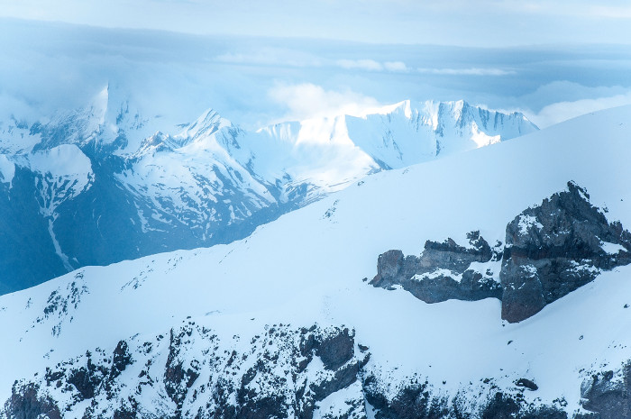 Шаг за шагом набираем высоту, по-колено утопая в свежевыпавшем снегу. Через несколько часов светлеет, но видимость тут же стремительно падает. Нам уже не до красот соседних вершин. Аккуратно выверяя каждый шаг и проделывая «ступеньки» первый в связке ведет нас по бескрайнему леднику. Потом мы меняемся. Монотонность ходьбы постепенно переходит в состояние механической апатии, когда шаг следует за шагом, след в след идущего впереди товарища.