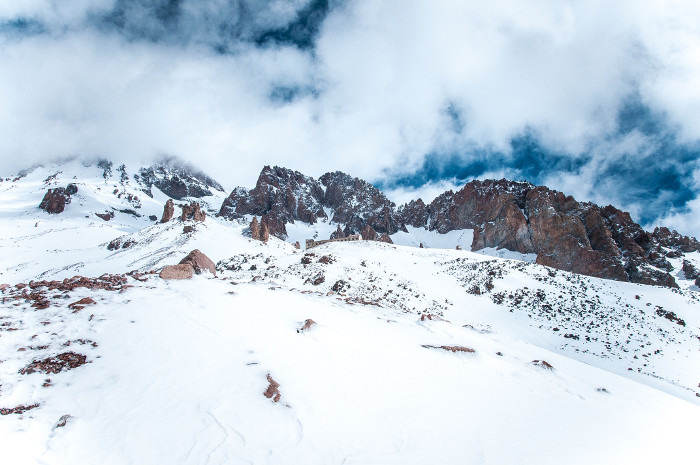 Первый тренировочный выход делаем к церкви Святого Георгия на высоте 4000 метров. Подъем отлично имитирует крутизну самого сложного участка на вершине. Церковь представляет собой железный вагончик обтекаемые формы. Растяжки из стальных тросов и груда наваленных камней предохраняют ее от разрушительных порывов ветра. Скромное внутреннее убранство – крохотный алтарь, несколько икон и подсвечников. Ничего лишнего, полное соответствие суровой реальности внешнего мира, где почти всё время лежит снег. Удар в колокол и пронзительный звон разносится над горами.