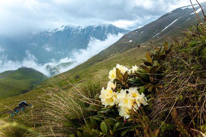 Дальше проезжих дорог нет. Нет и канаток, как на Эльбрусе. Пешеходная тропа петляет через камни, кочки, заросли ромашек и рододендрона. Подъем достаточно крутой, но это с лихвой компенсируется окружающей красотой. Самое сложное - выбрать нужный темп, чтобы дыхание не сбивалось и не приходилось останавливаться. Наша цель – перевал Саберце. Можно, конечно, рвануть выше и за день добежать до метеостанции на 3650 м, но отсутствие акклиматизации гарантирует жуткую головную боль и бесперспективность дальнейшего восхождения.