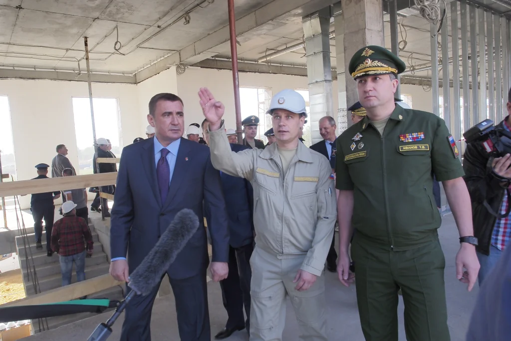 Работа на стройке не прекращается ни на минуту. А между тем проверить ход работ приехали заместители министра обороны РФ Юрий Садовенко и Тимур Иванов. Их сопровождал врио губернатора Тульской области Алексей Дюмин.