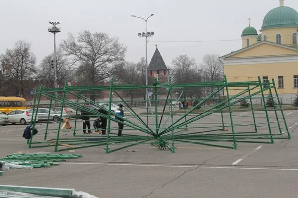 На Центральной площади Тулы уже приступили к установке главного новогоднего украшения города. Совсем скоро красавица-елка начнет своей красотой радовать туляков. А пока... пока все находится на стадии сбора конструкции.