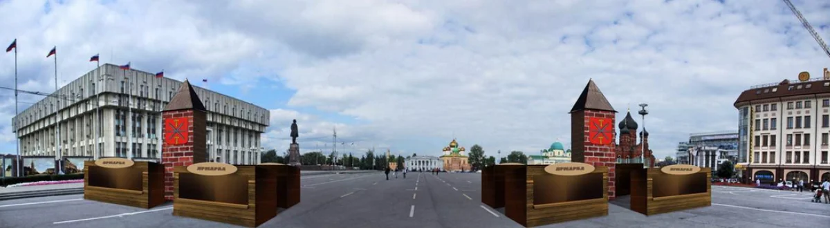 На время праздничных мероприятий главную площадь города решили украсить необычной входной группой в виде двух башен.