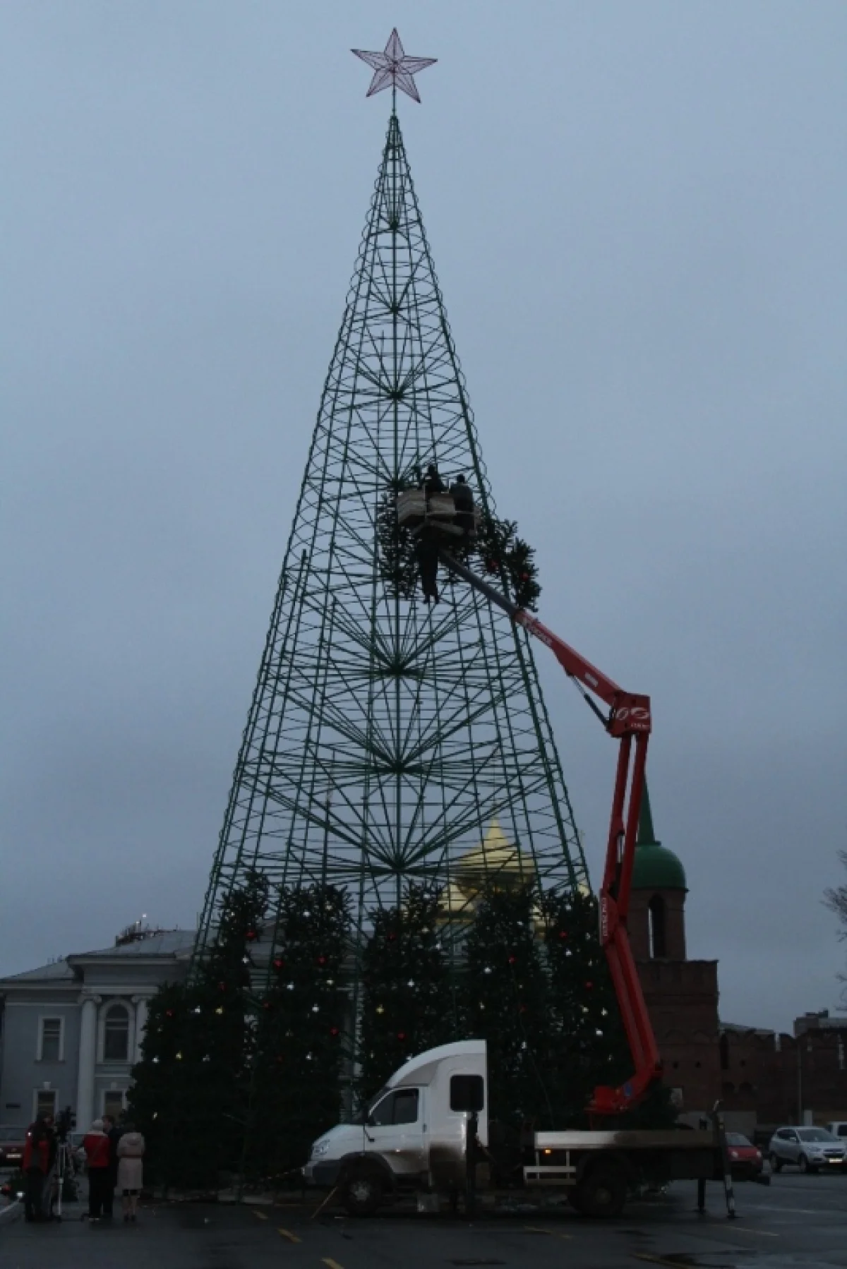 На центральной площади Тулы продолжаются работы по сборке и оформлению ключевой конструкции в предстоящих праздниках – новогодней елки. Напомним, что в этом году высота «праздничного дерева» составит 32 метра.