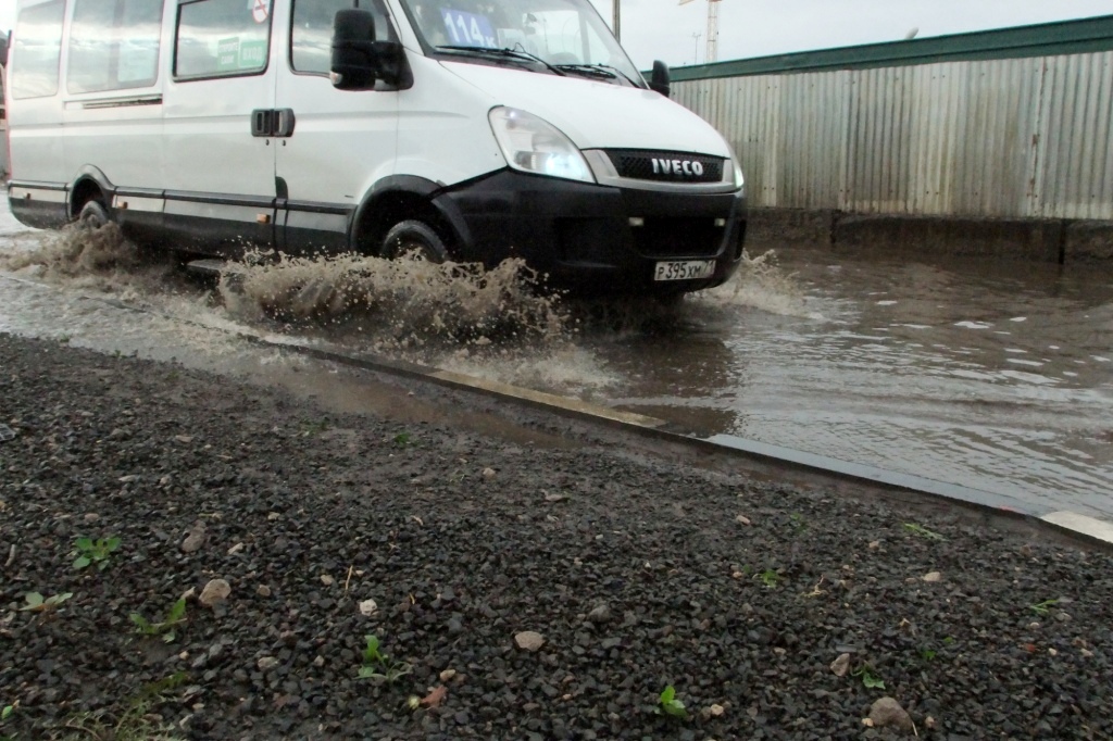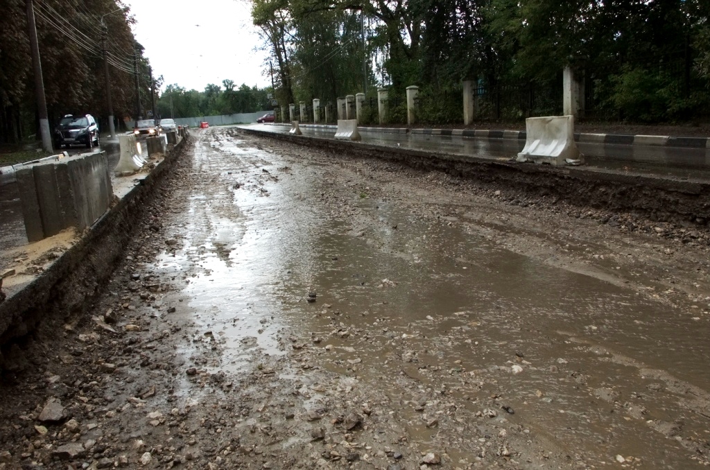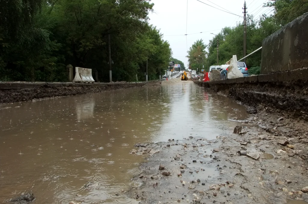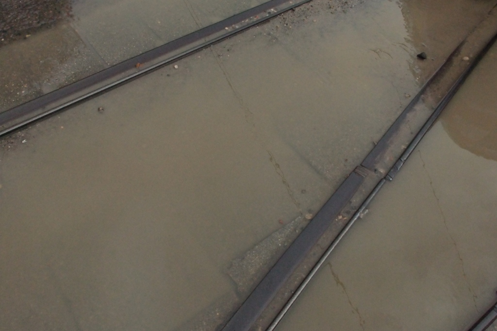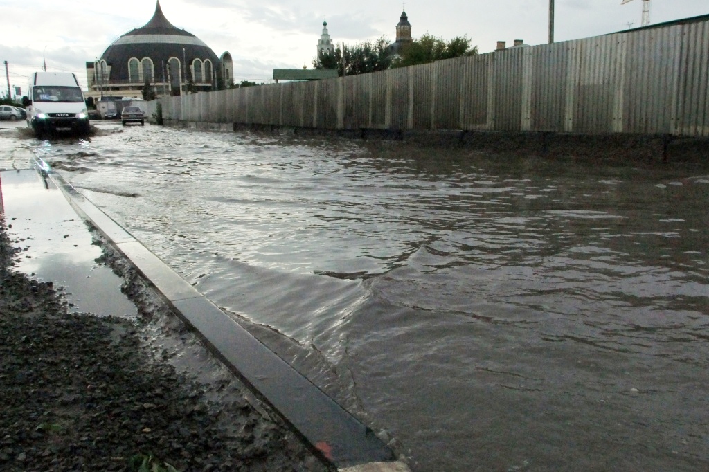 Так, например, на ул. Тимирязева в котловане, где чинят трамвайные пути, сверху стекают настоящие ручьи. Все это образует обширную лужу внизу. Ну а дождь только добавляет объем этому озеру. Да, в сравнении с тем, что мы увидели в Заречье, этот водоем - все-таки мелкое озеро.