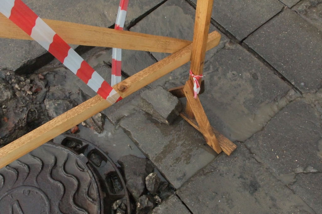 Правда, это «море» сейчас под угрозой исчезновения. Понемногу оно утекает в канализационный люк, который огорожен специальным аварийным знаком.