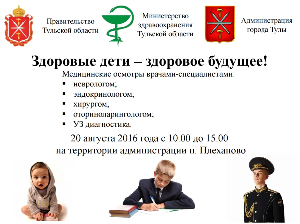 Медосмотр маленьких жителей поселка Плеханово будет проходить 20 августа с 10:00 до 15:00 на территории администрации (ул. Заводская, 15).
