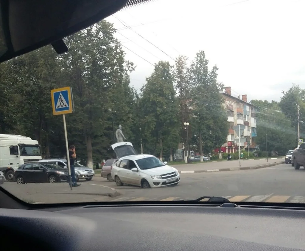 Сегодня, 20 августа, в социальной сети появились фотографии происшествия. В центре Новомосковска «Лада Гранта» провалилась в люк колесом .