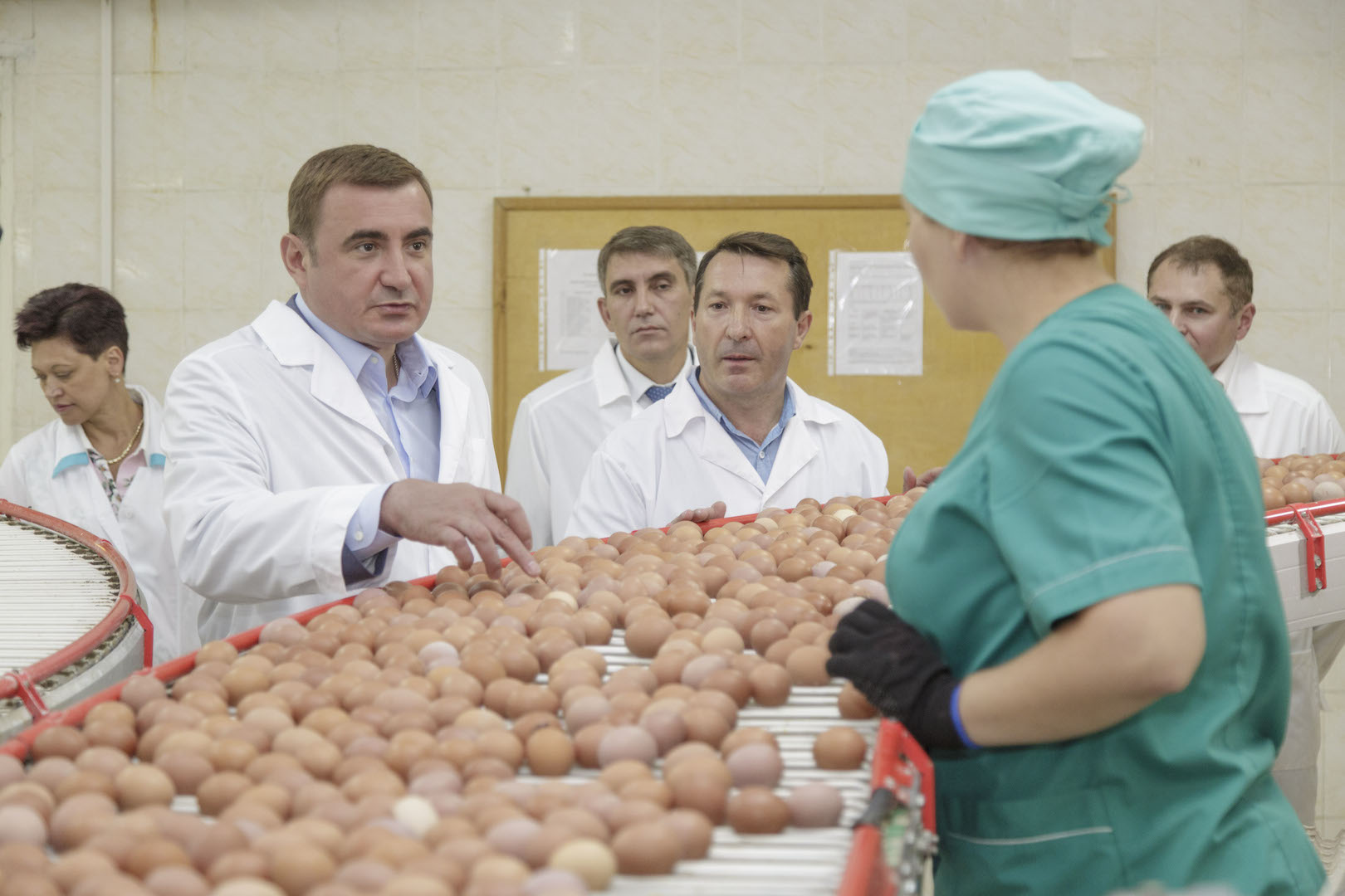 Алексей Дюмин, побывав на предприятии, осмотрел цех для содержания кур-несушек, цех сортировки и упаковки яйца, цех готовой продукции.