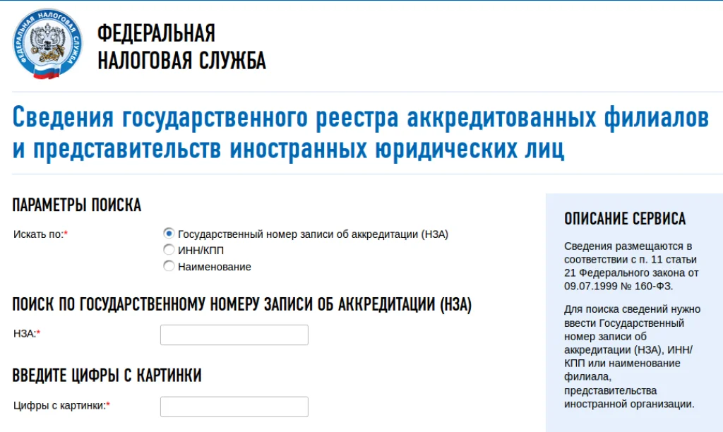 Чтобы воспользоваться данным сервисом, достаточно ввести в поле поиска один из трех параметров: государственный номер записи об аккредитации (НЗА), ИНН/КПП или наименование филиала, представительства иностранной организации.