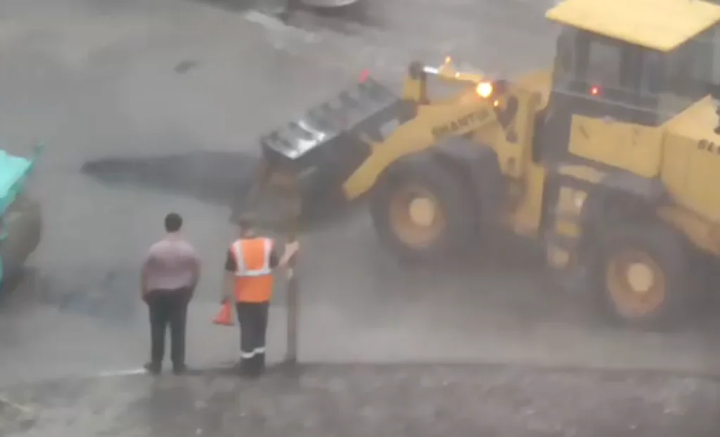 В сети появилось видео, на котором коммунальщики ведут дорожные работы под непрекращающимся ливнем. На перекрестке
