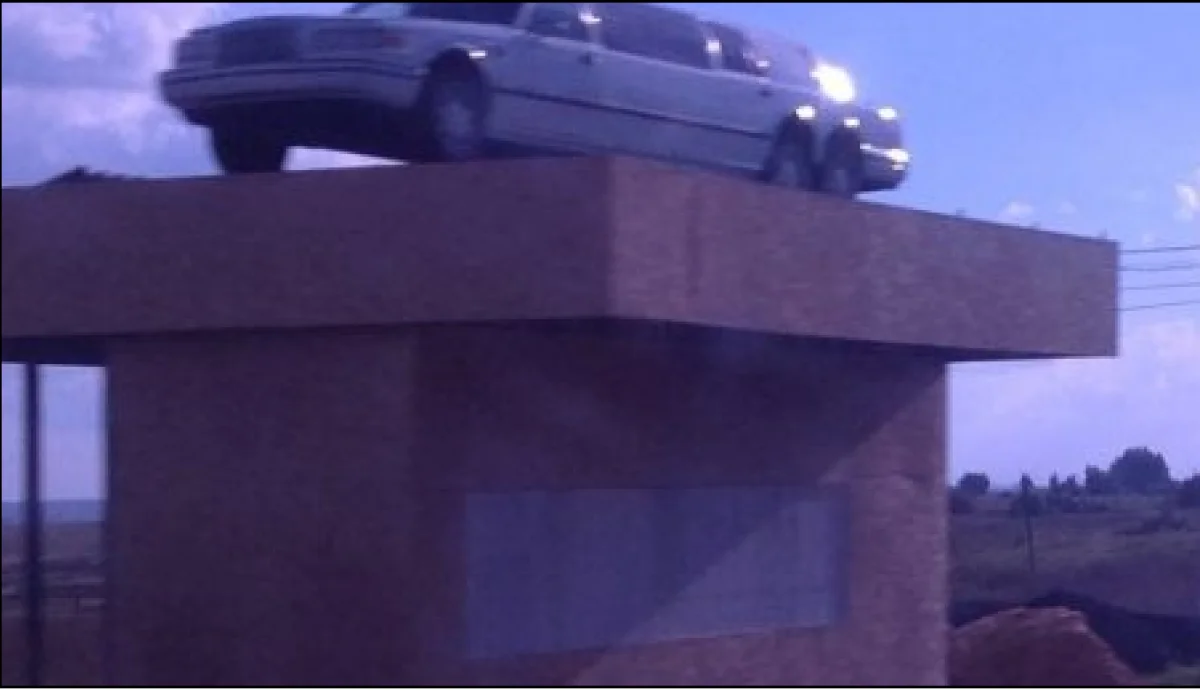 В Киреевске, возле «Кургана Бессмертия», на крыше торговой палатки появился белый лимузин. Зачем автомобиль «забрался» так высоко — пока не известно: то ли это новый арт-объект, то ли рекламная кампания владельцев ларька.