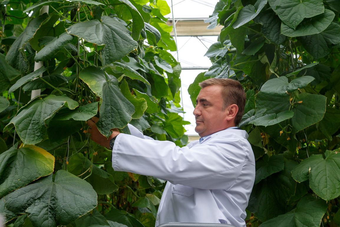 Алексей Дюмин посетил несколько тепличных цехов и совершил небольшую поездку вдоль высоких огуречных рядов. И конечно, попробовал свежий огурец прямо с ветки. После чего поинтересовался у руководителя хозяйства Олега Останина, как выращивают здесь овощи: