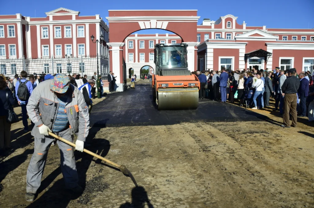 Как сообщает наш корреспондент с места событий, в Тульском суворовском училище доработки шли полным ходом за 40 минут до начала торжественной линейки. Рабочие клали асфальт.