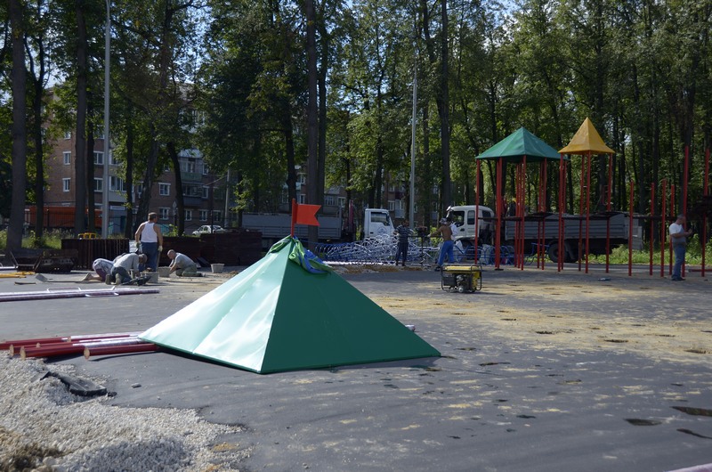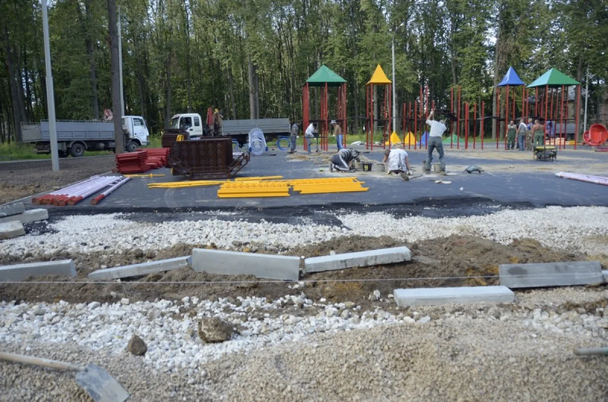 В березовой роще возле Щегловского монастыря устанавливают детский игровой комплекс. Маленькие жители окрестных домов теперь смогут покачаться на качелях и полазать на лестницах и горках.