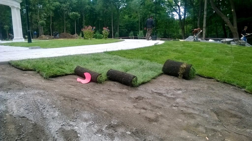 А чуть выше набережной укладывают рулонный газон, который предназначен специально для парков. Он удобен тем, что его можно укладывать с весны до осени и ходить по нему можно уже через 2-3 недели не боясь, что с травой что-то случится.