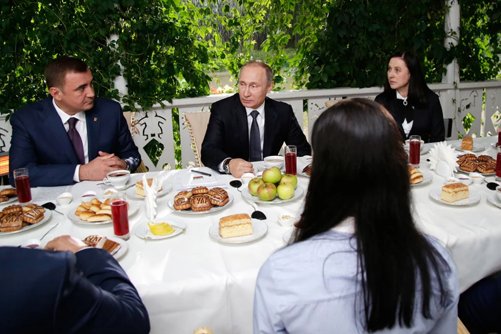 Во время встречи столы украшали не только угощения, но и Филимоновская игрушка. Владимир Путин с удовольствием ел тульские пряники и запивал их чаем из самовара. Также Президента угостили пирогом, который традиционно готовила Софья Андреевна для Льва Толстого.