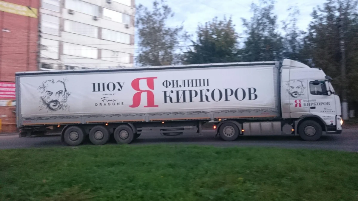 Вот такой «филипповоз» запечатлели очевидцы на улицах города. Перемещается ли певец лично посредством такого транспорта, или фура – всего лишь гардероб для костюмов, история умалчивает.